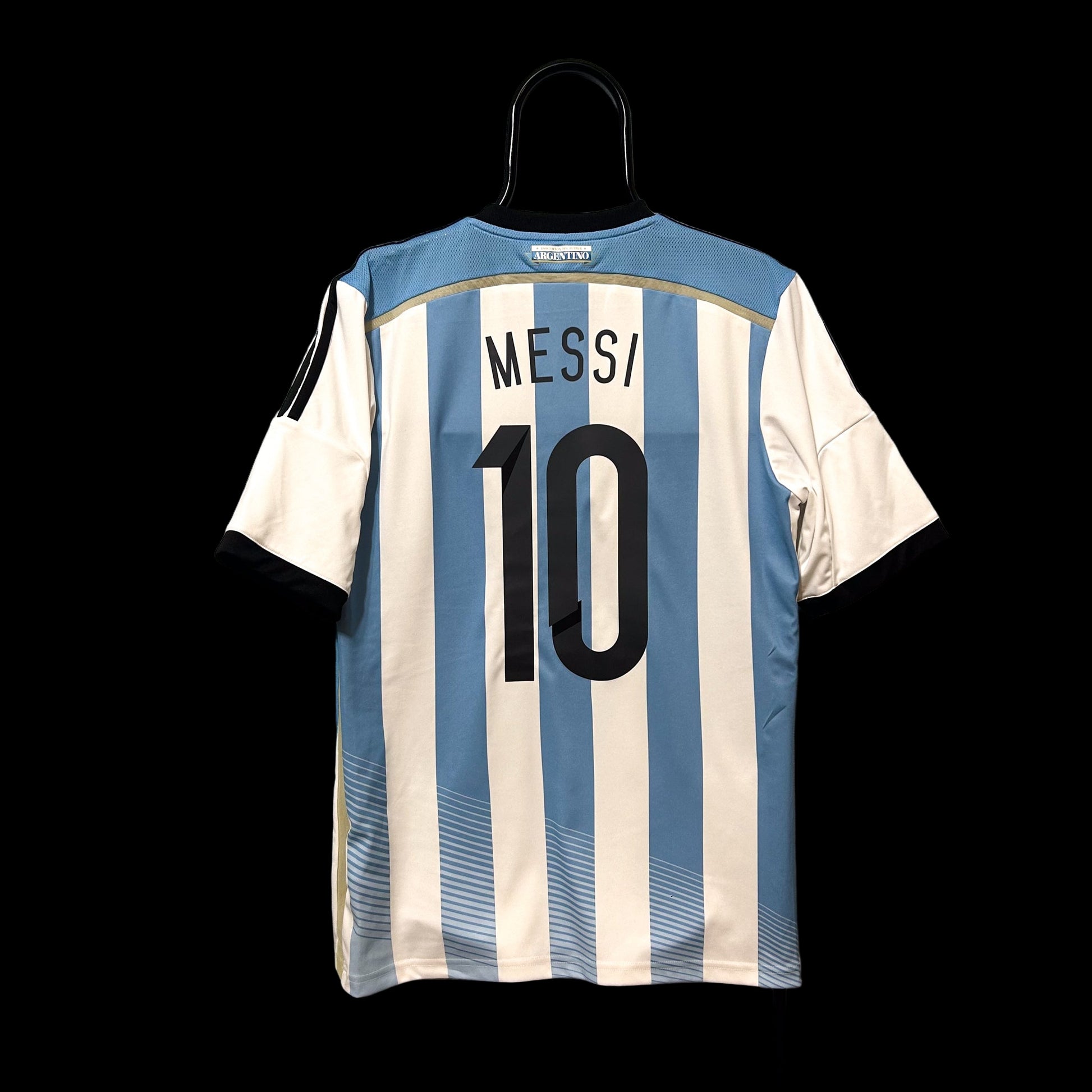 Produced by Adidas (model G74569), this shirt comes from the historic period leading into the 2014 FIFA World Cup, where Messi captained Argentina to the final in Brazil.