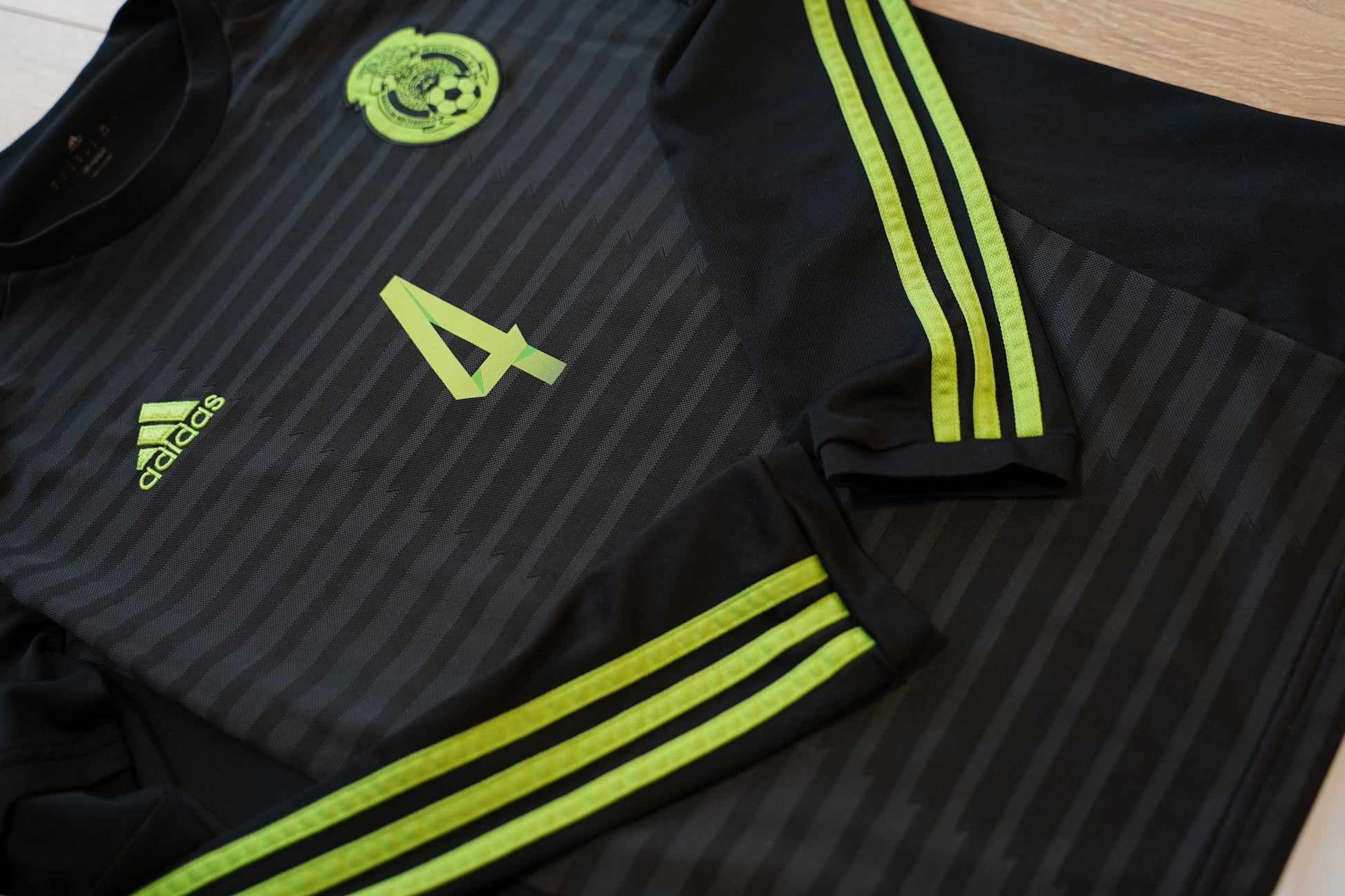Produced by Adidas (model M36000), this is the long-sleeve version — much rarer than the standard short-sleeve release — and showcases Mexico’s bold black redesign for this era.