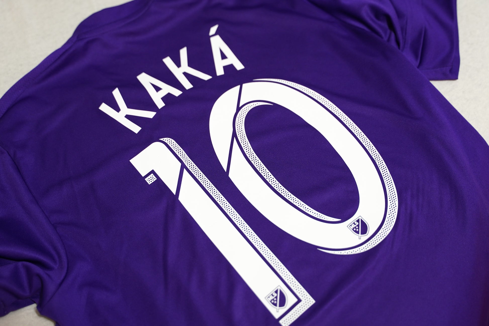 Original Orlando City SC home jersey from the 2015–2016 MLS season featuring number 10 for global superstar Kaká. The shirt is used, in very good condition — clean material, vivid purple color, and well-kept Adidas and sponsor prints.