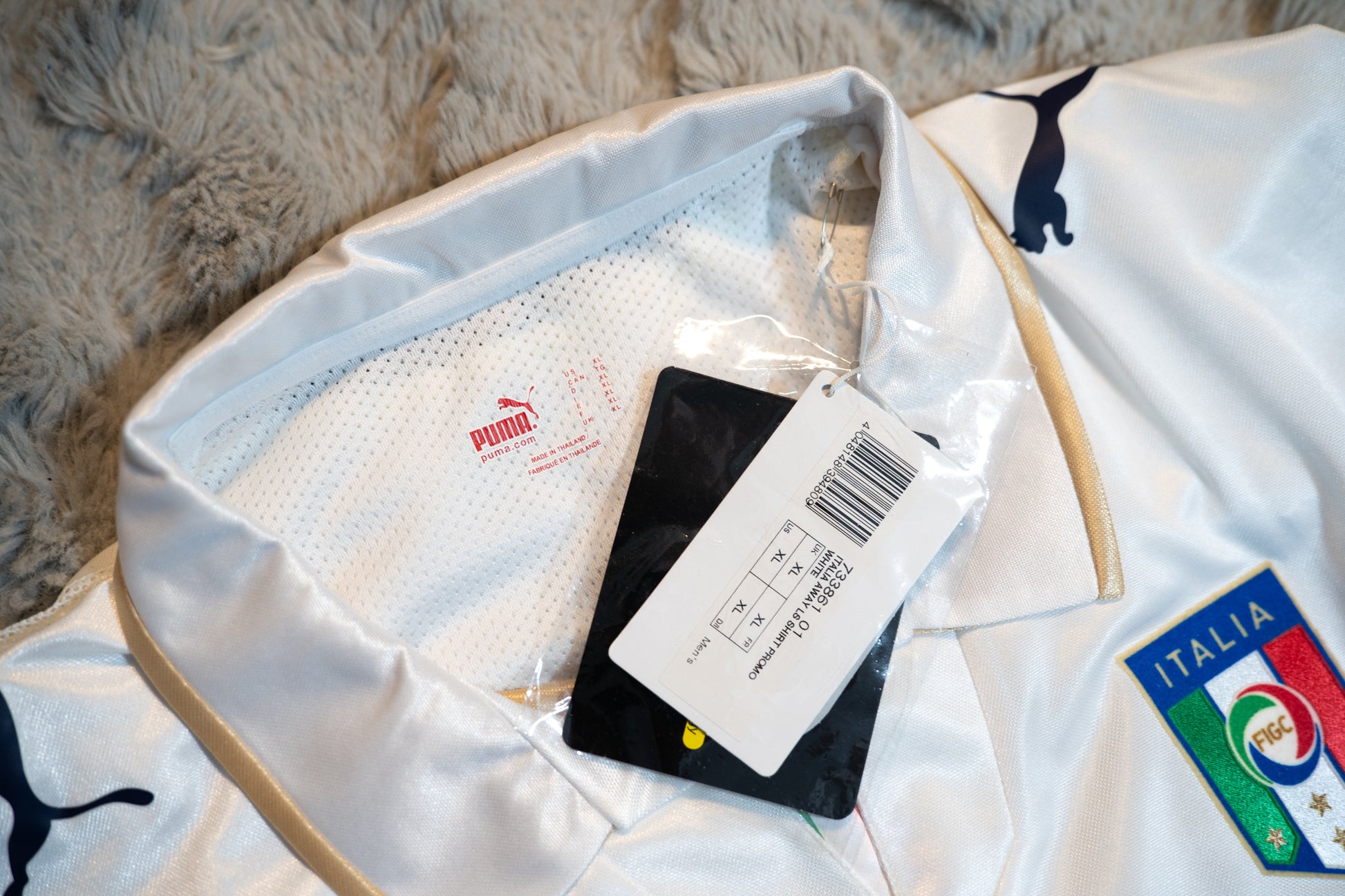 The shirt is brand new with original tags (BNWT) and was produced by Puma, showcasing Italy’s classic away design from the post-World Cup era.